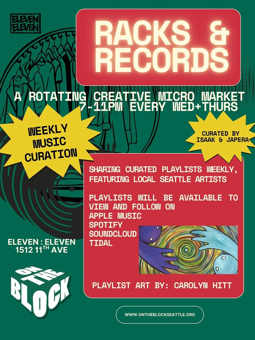 Seattle’s love for music, style, and community comes together at Racks & Records, a rotating creative micro-market hosted by our friends at On The Block and Eleven:Eleven. The event brings together local vendors selling everything from clothing and jewelry to art and other unique finds, creating a laid-back space to shop thoughtfully and support small creatives.